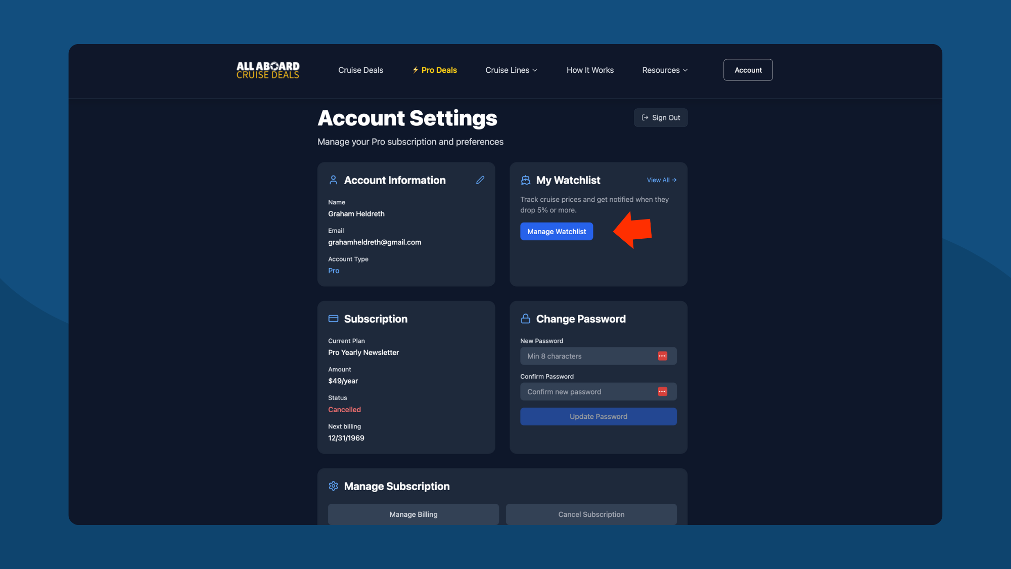 Access your full account settings on the All Aboard Deals website. Here you can:
