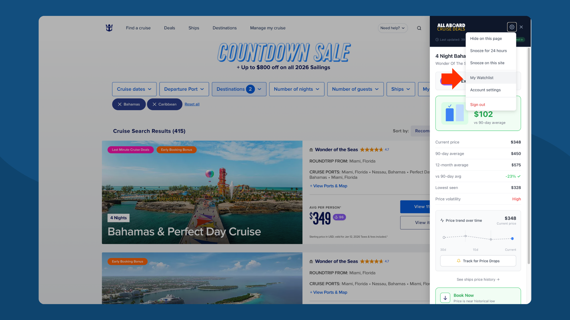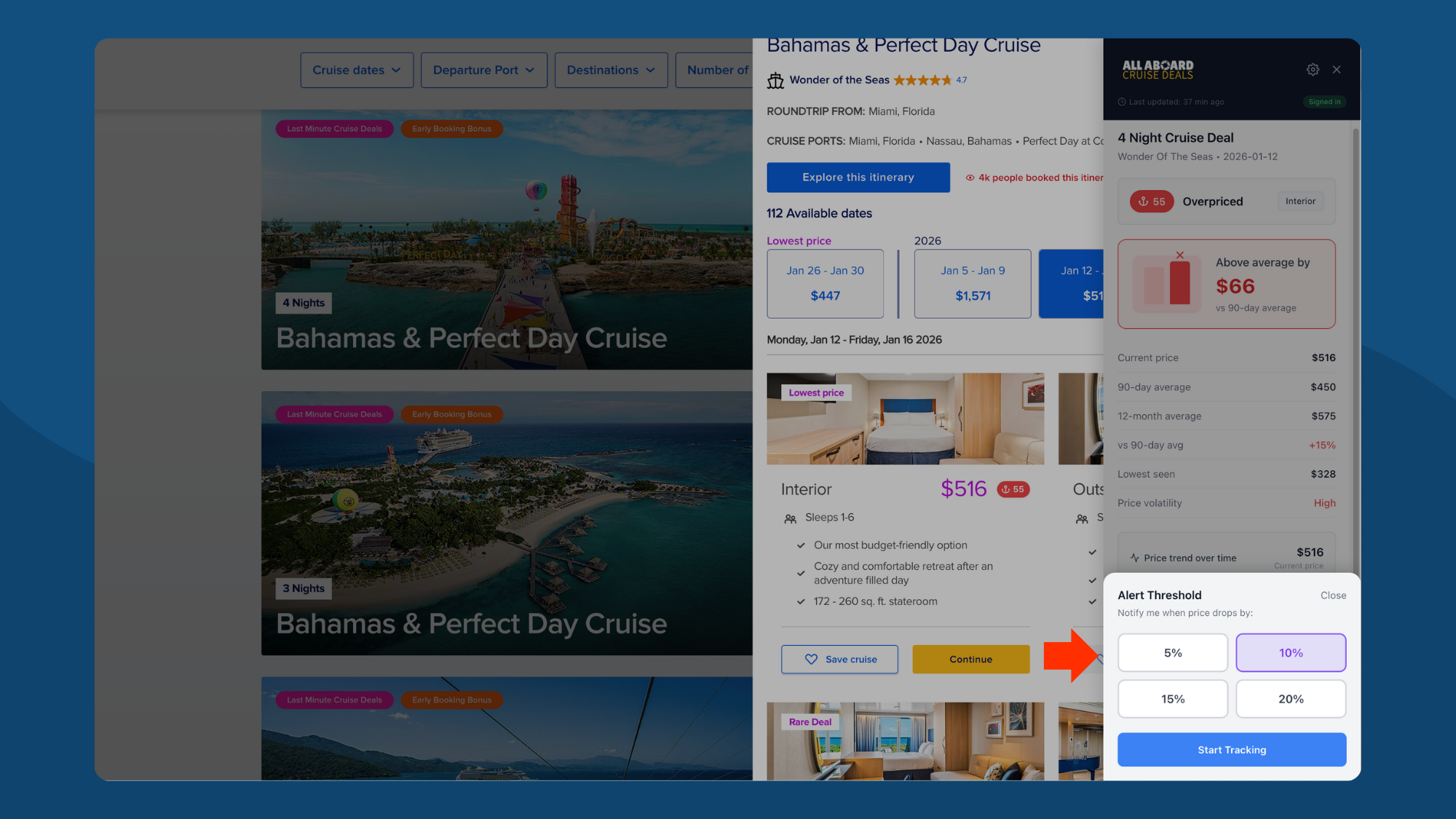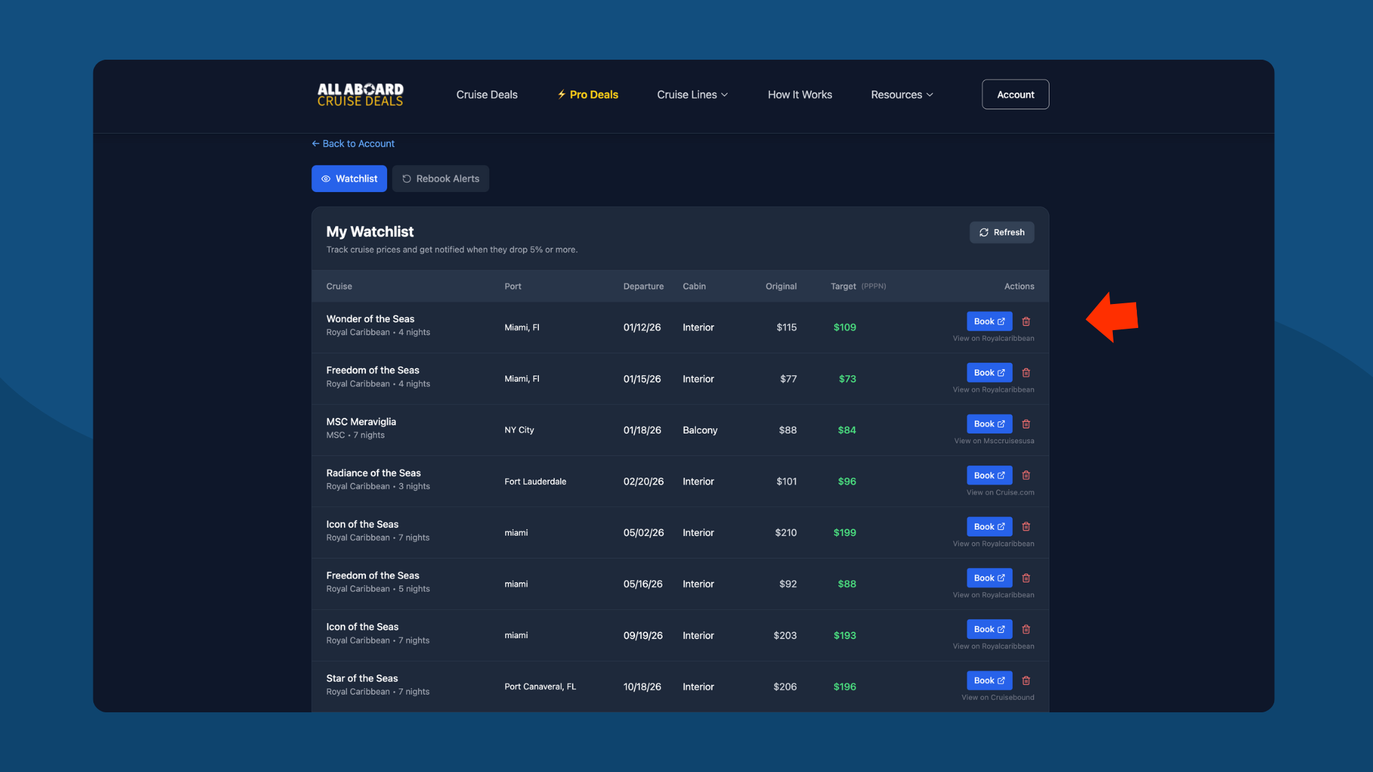 View all tracked cruises in one place. See the original price when you started tracking, target alert price, and quick links to book.