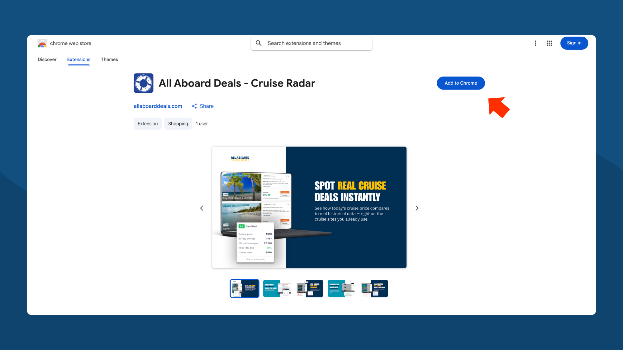 Click the puzzle piece icon in Chrome's toolbar, find "All Aboard Deals - Cruise Radar," and click the pin icon.