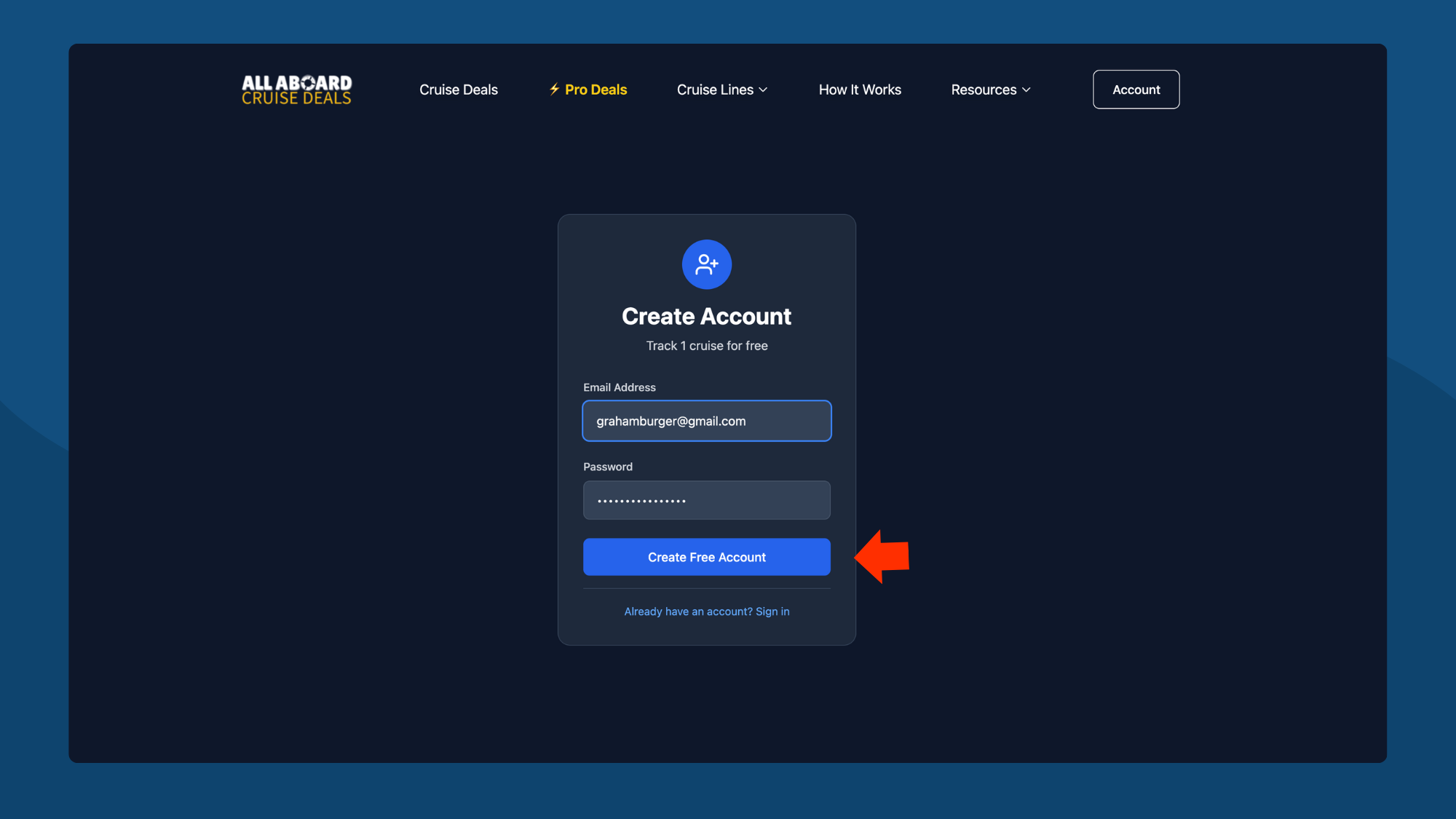 Enter your email and create a password, then click Create Free Account.