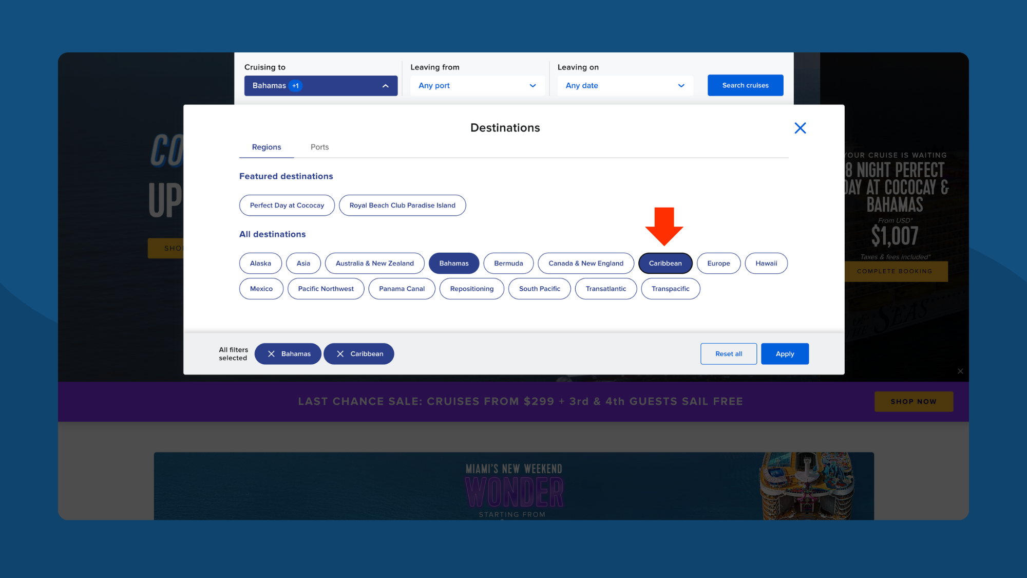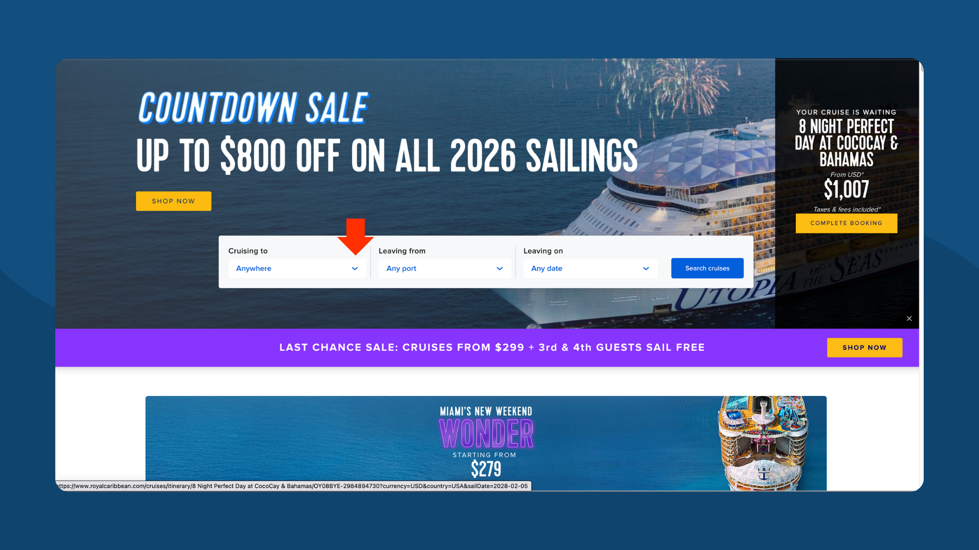 Go to any supported cruise site. In this example, we're on Royal Caribbean. Use the search filters to find cruises — destination, port, dates, etc.