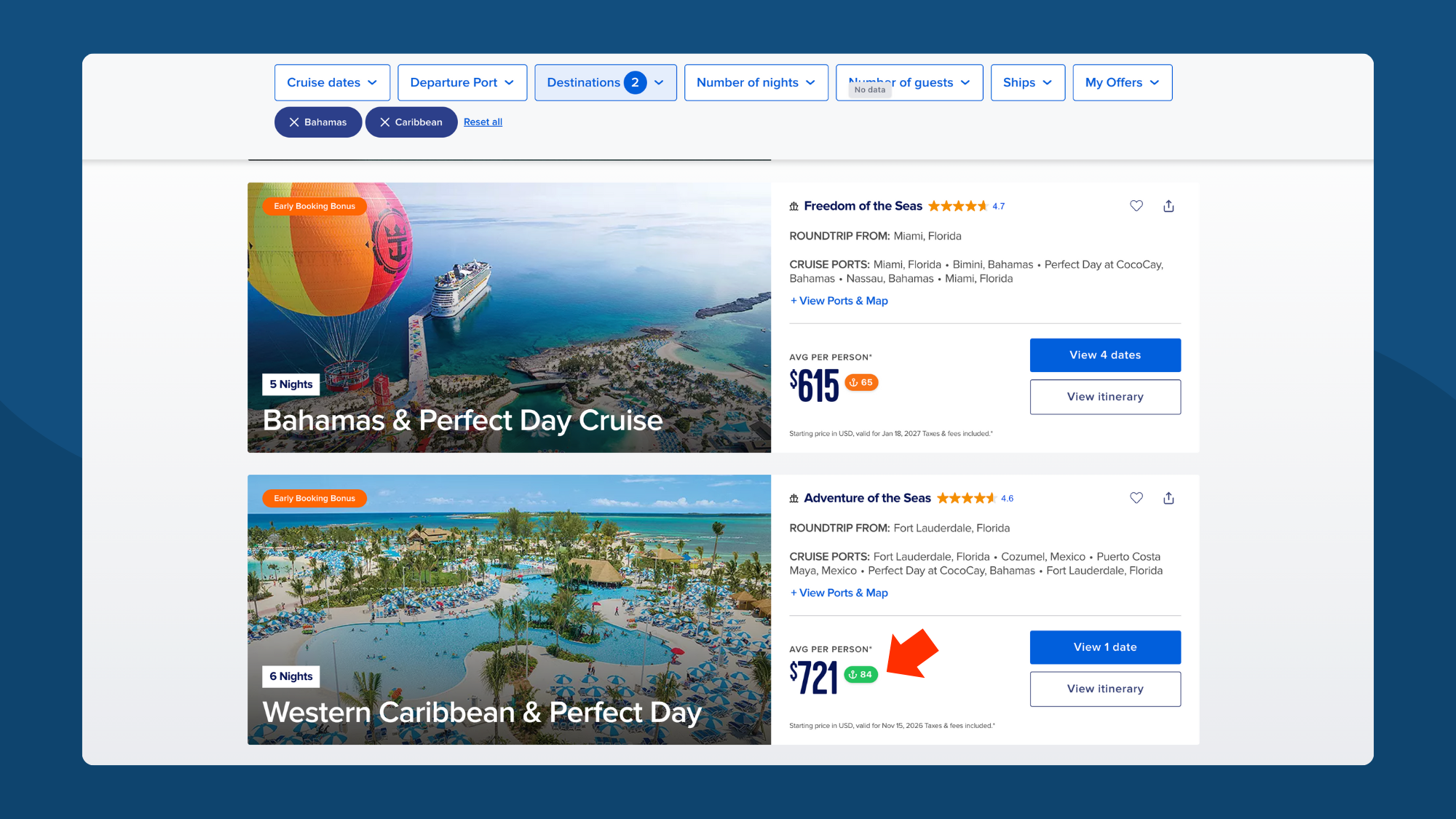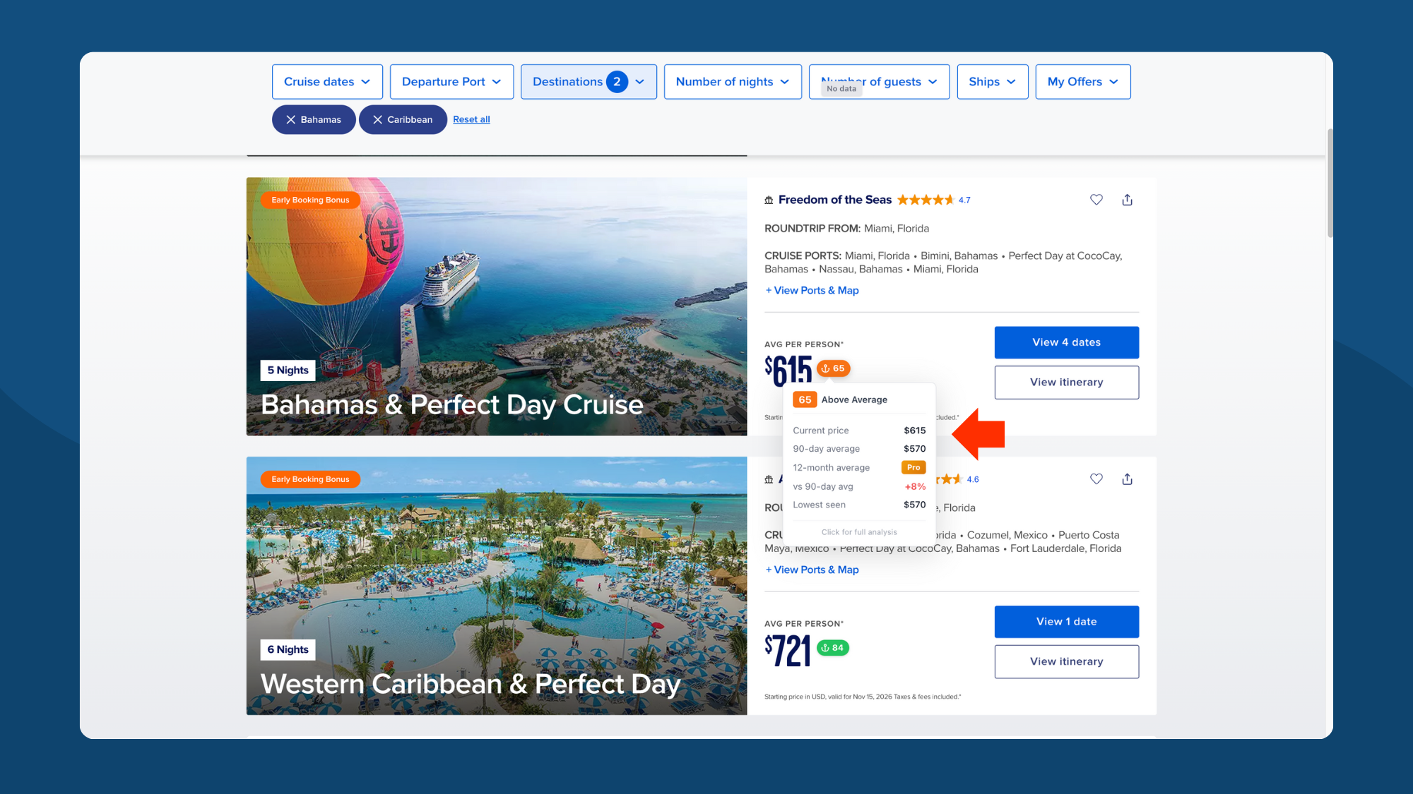 Check multiple dates. The same ship and itinerary can have wildly different scores depending on departure date.